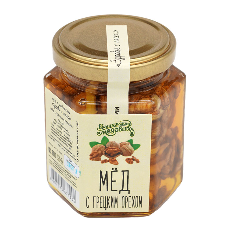 Башкирский мёд с грецким орехом являюеся и продуктом питания и активным лекарственным средством. По калорийности грецкий орех в 2 раза превышает пшеничный хлеб высшего сорта.