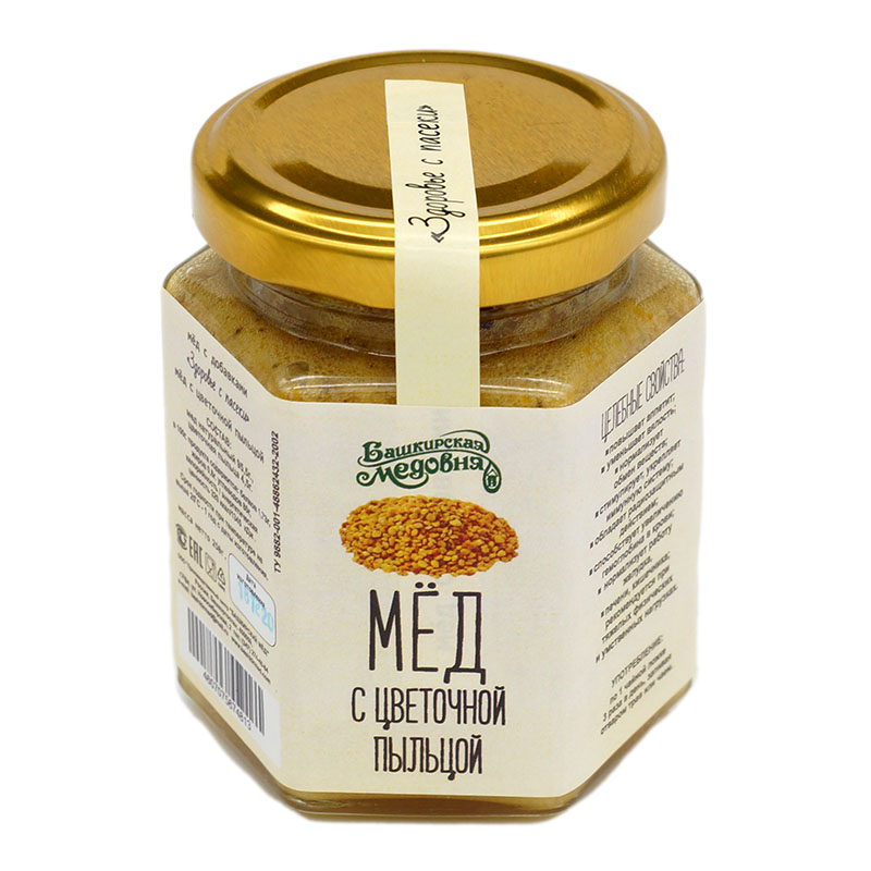 Башкирский мед с цветочной пыльцой - повышает аппетит, уменьшает вялость, стимулирует имунную систему, обладает радиозащитным действием, способствует нормализации работы печени, желудка, кишечника и др.
